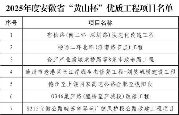 近日,安徽省住房和城鄉(xiāng)建設(shè)廳公布了2025年度安徽省“黃山杯”優(yōu)質(zhì)工程項目名單,公司7個項目榮耀登榜,創(chuàng)下公司年度獲獎數(shù)量歷史新高,獎項涵蓋公路、市政等多個領(lǐng)域,充分彰顯了公司在工程建設(shè)領(lǐng)域的雄厚技術(shù)實力與精益求精的匠心品質(zhì)。