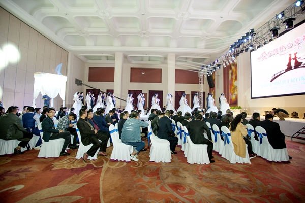 10點10分,一曲精妙絕倫的舞蹈《因為愛情》拉開了集體婚禮的帷幕。率先出場的是十二位帥氣的新郎,他們以一段酷炫的舞蹈表達(dá)了心中難以抑制的激動,將現(xiàn)場氣氛推向高潮。伴著優(yōu)美的樂曲,十二位美麗的新娘在眾人的注視下緩緩步入會場,來到新郎身邊。在浪漫的婚禮進(jìn)行曲中新人們雙雙進(jìn)入禮堂,在現(xiàn)場觀眾的見證下彼此交換信物。隨后,美麗的新娘們將手中的捧花拋給在場的單身男女們。