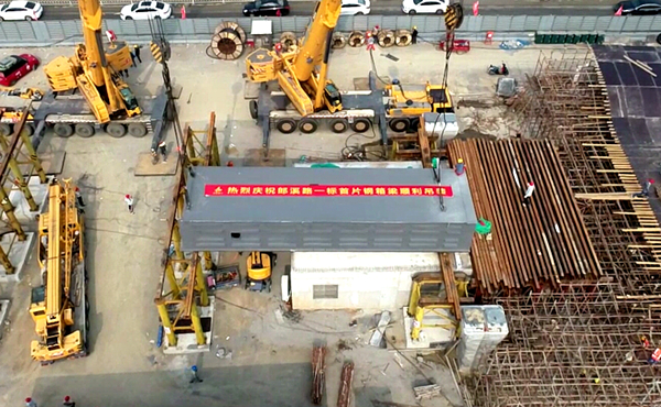 郎溪路(裕溪路—明皇路)工程01標項目首片鋼箱梁成功吊裝